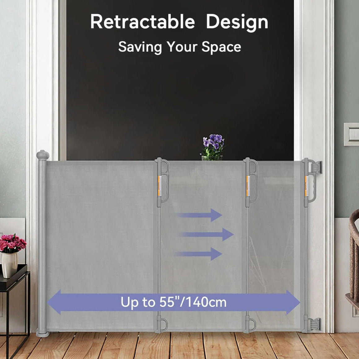 The Retractable Baby Gate offers a safe and secure environment for your little ones by featuring a double locking mechanism that keeps curious crawlers away from danger. With its retractable design, it fits openings up to 55" wide and stands 33" tall, easily adjustable to suit your space. The mesh can be fully retracted when not in use, saving space. The gate is easy to operate, allowing you to lock and unlock it with one hand, perfect for busy parents holding babies or carrying items. Ideal for doorways and stairs, it provides a practical solution to keep both babies and pets safe and secure throughout the house.