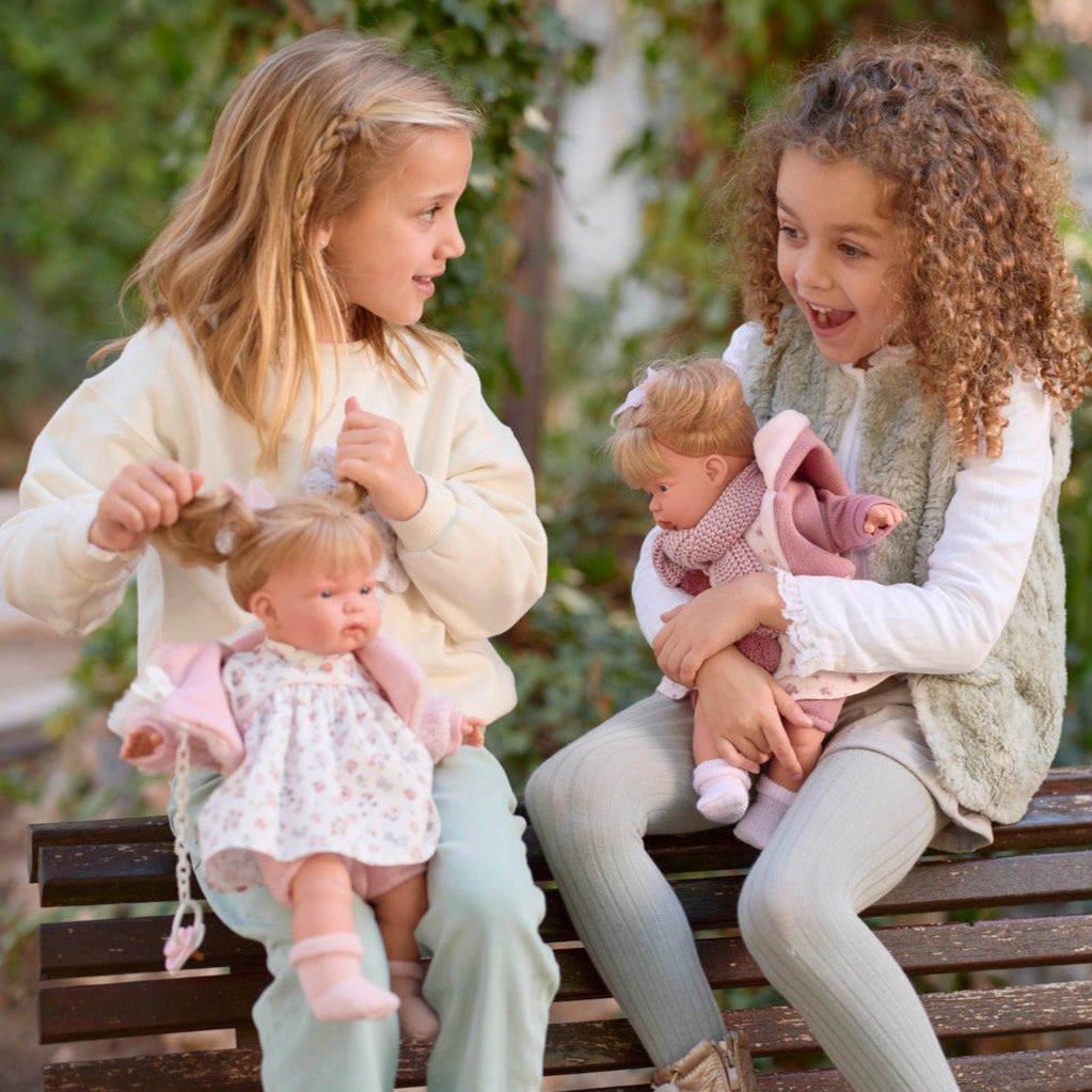 Roberta, who loves to go out and play with her friends. She is wearing a flower print dress and a matching 100% wool jacket.