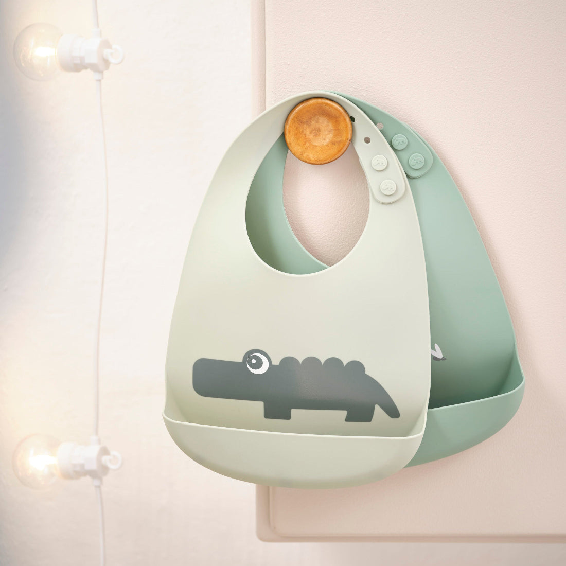 A set of two silicone bibs in green, featuring Croco and Birdee designs. Waterproof with adjustable neck closure and a front pocket to catch food. Easy to clean and durable.