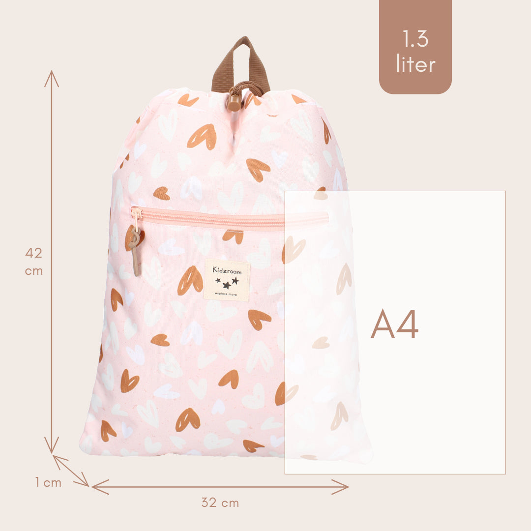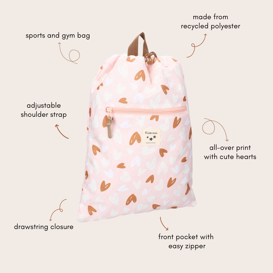 This gym bag is an ideal item to take to gym or swimming lessons. It comes in pink colour and features an all-over heart print. The bag has a drawstring closure and adjustable shoulder straps. The bag also has a super handy front zip pocket for small items such as keys, rubber bands or a wallet. Furthermore, this gym bag is made of 100% recycled polyester. This also makes this fun item very sustainable. With the adjustable shoulder straps, this bag can be customised for everyone. So even the smallest children can enjoy a super cool gym bag!