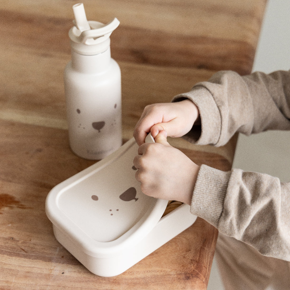 This beautiful lunchbox by Kidzroom from the 'Beary Excited' collection is a real must-have for children. The lunchbox has a stylish beige colour and is decorated with a cute teddy bear face. Thanks to the soft silicone material, the lunchbox is easy to open and close, perfect for little kids. The inside is cleverly divided into three compartments, so you can keep all parts of your lunch neat and fresh. The silicone material means it can go in the microwave and dishwasher. Practical and cute at the same time! Add this enchanting lunchbox from Kidzroom to your range today. View and shop the matching drinking cup and backpack from the “Beary Excited” collection to complete the set.