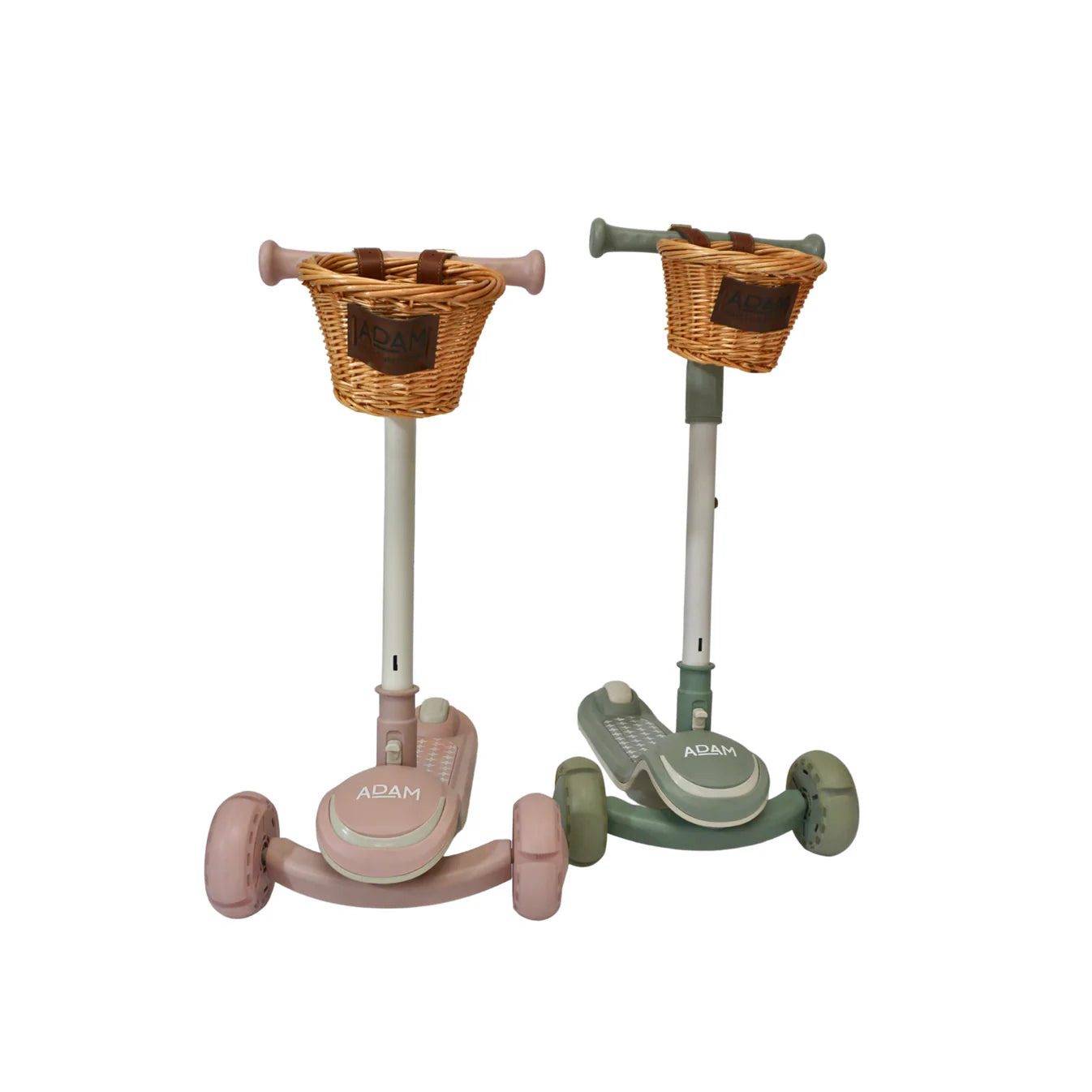 Stable, safe, and stylish. This 3-wheel scooter is perfect for children from the ages of 2 years old until 6 years old. Features an adjustable handlebar, wide anti-slip deck, smooth wheels, and a front LED light for extra fun and visibility. Available in pastel pink or sage green, with a front basket for extra playtime storage.