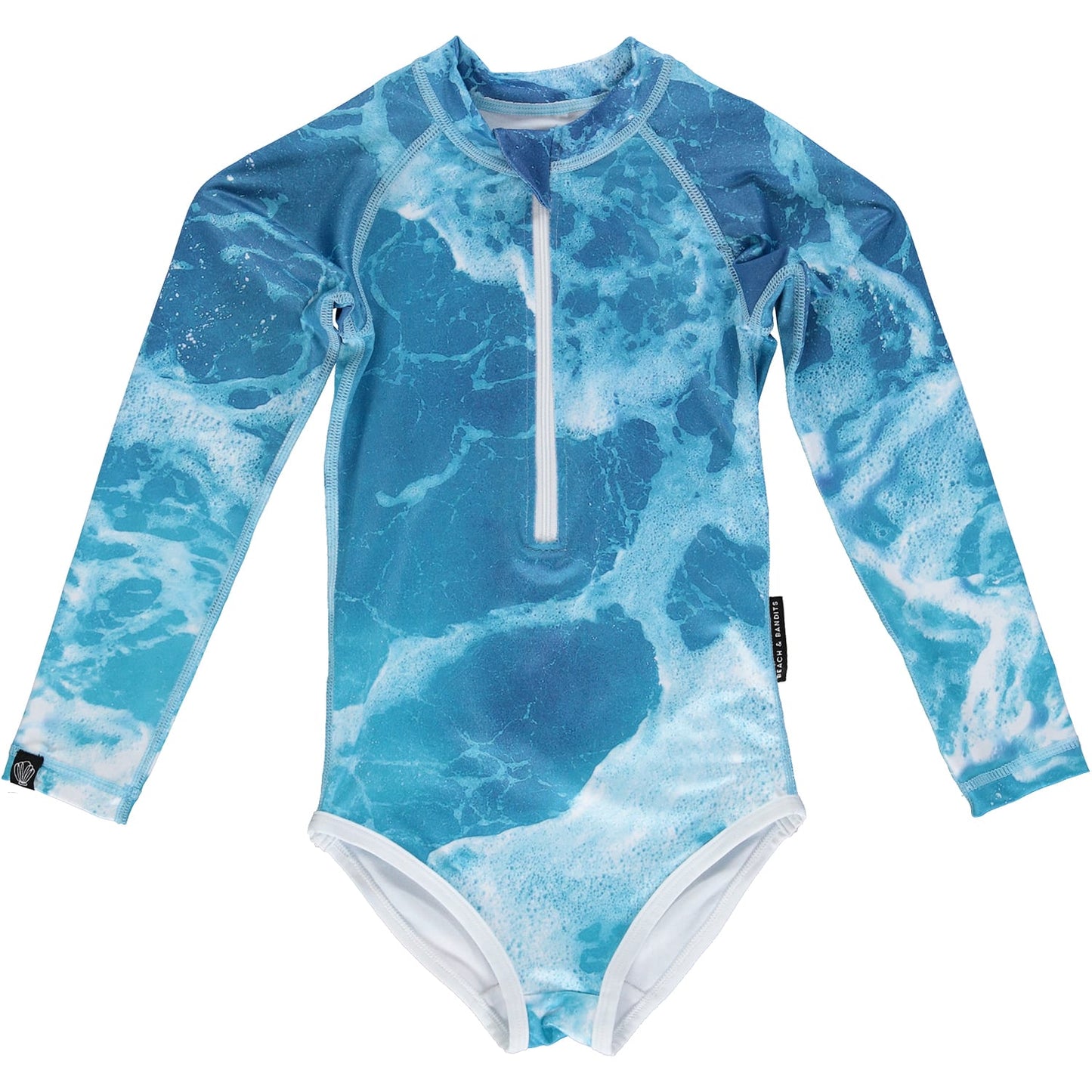 Trendy and sun-protective rash guard suit with long sleeves. This collection features a rich and UV-resistant material. It is breathable and very comfortable to wear. Especially for young children who want to run around on the beach or by the pool!