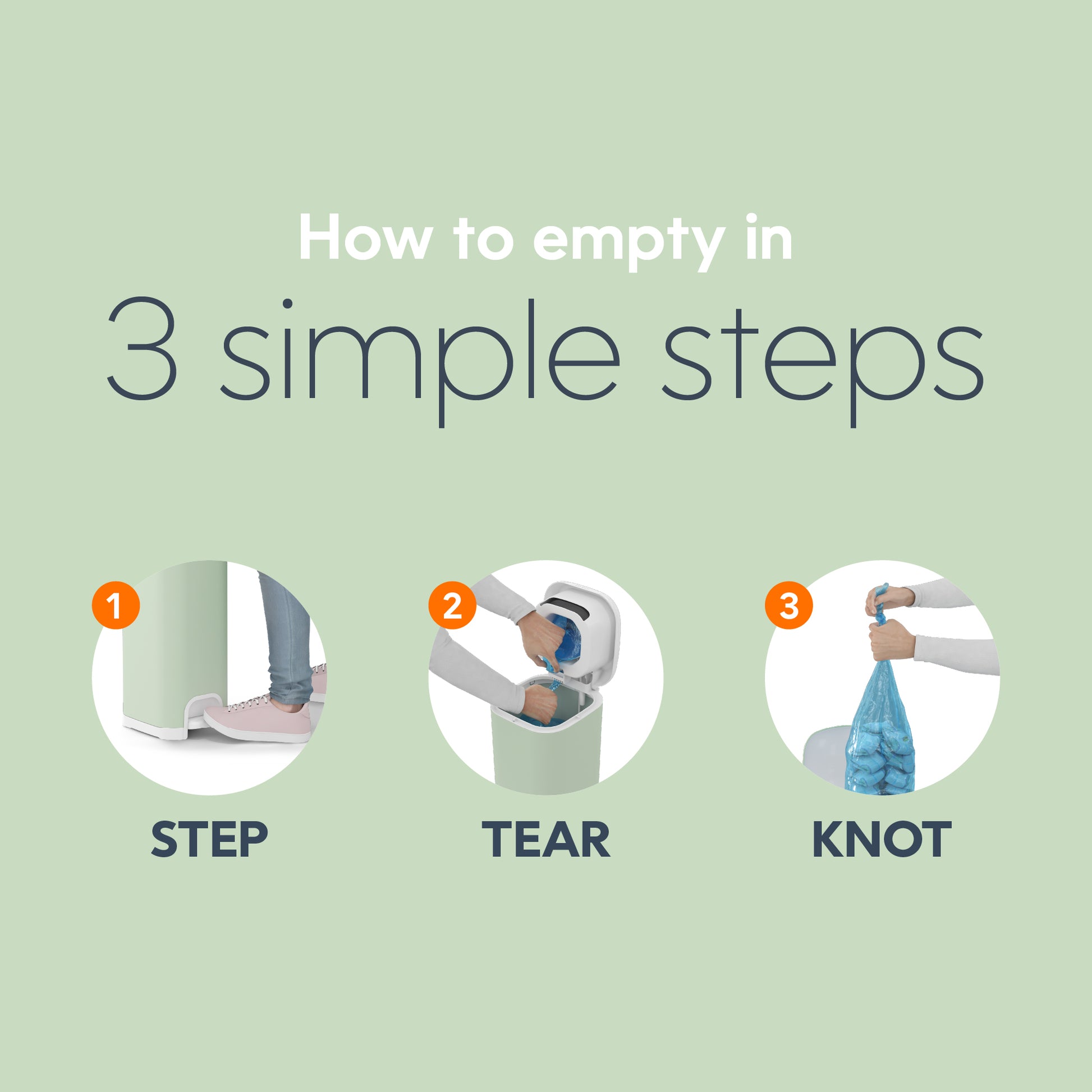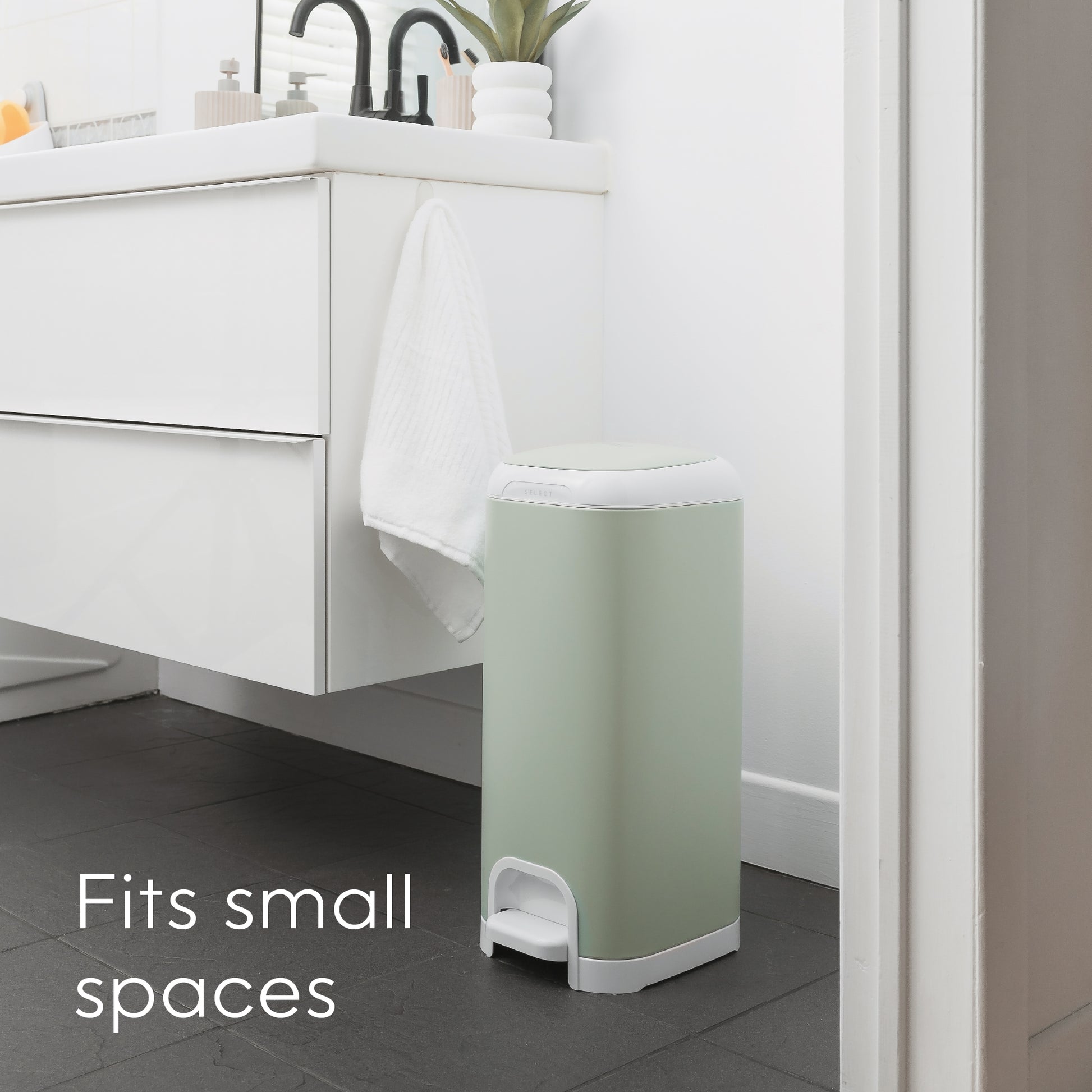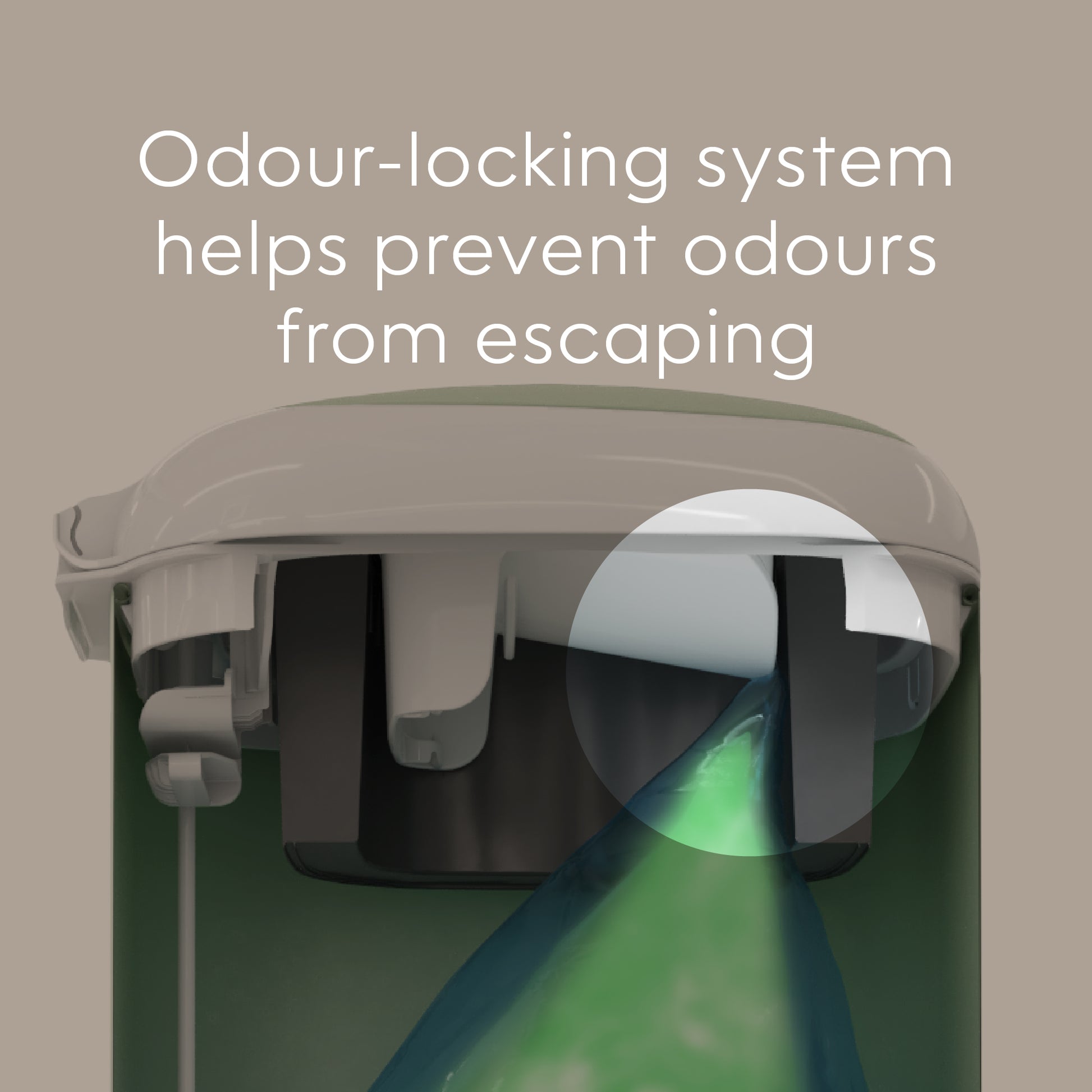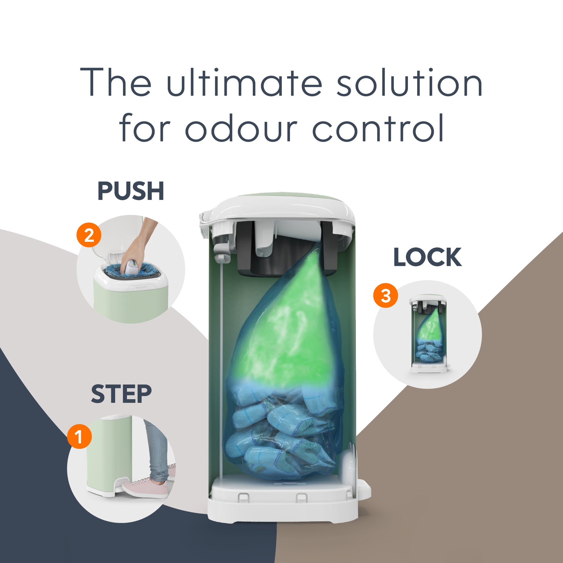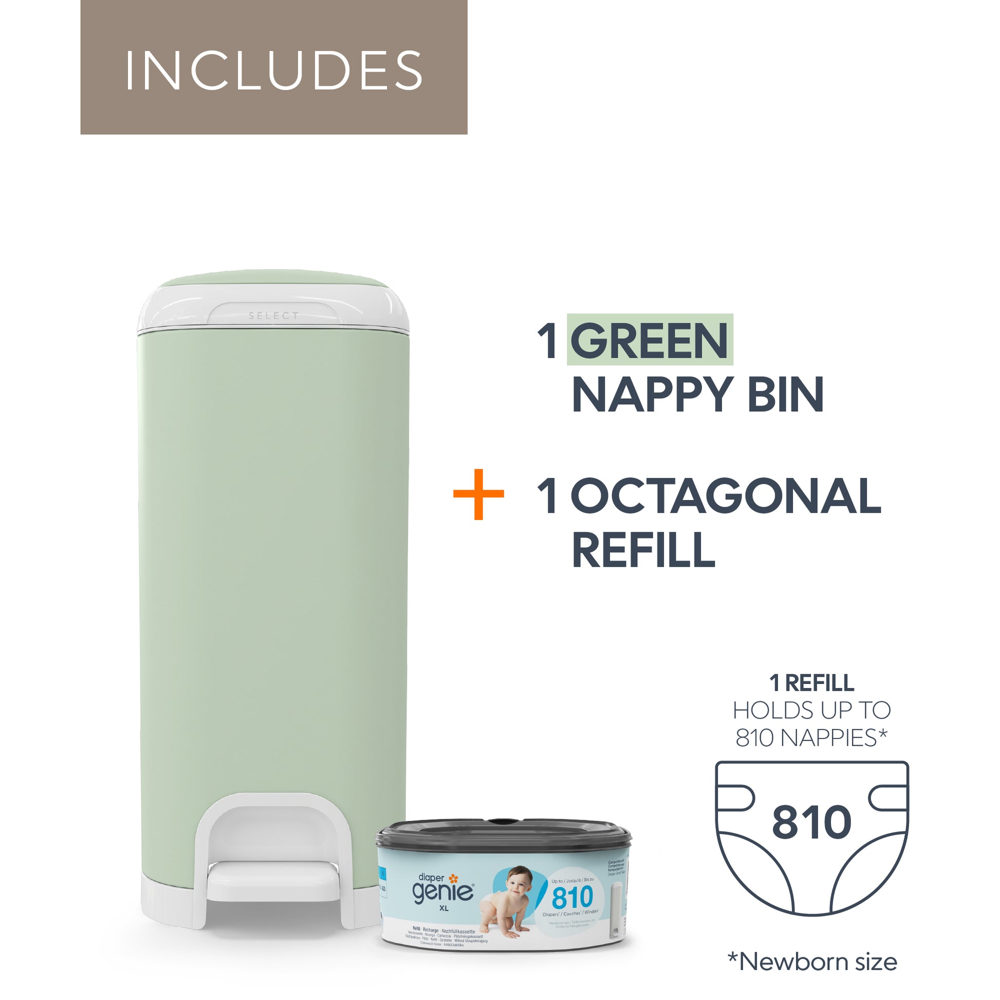 Introducing the new Diaper Genie Select Bin, a sleek addition to your nursery designed with both style and durability in mind. Crafted from durable stainless steel, the new Diaper Genie Select bin features a Push N Lock odour locking clamp that effectively helps to contain odours of messy nappies. For added convenience, the Select nappy disposal system features a 52.1 cm height and a wide opening, along with a foot pedal for easy, one-handed operation Our new metal nappy bin can hold up to 40 newborn diapers and comes with a multi-layer octagonal refill film, featuring our advanced Max Odour Lock technology. The XL octagonol refill can securely hold up to 810 newborn diapers, offering extended usability. The Diaper Genie Select is available in 3 colours : Lily White, Stone Grey and Sage Green.