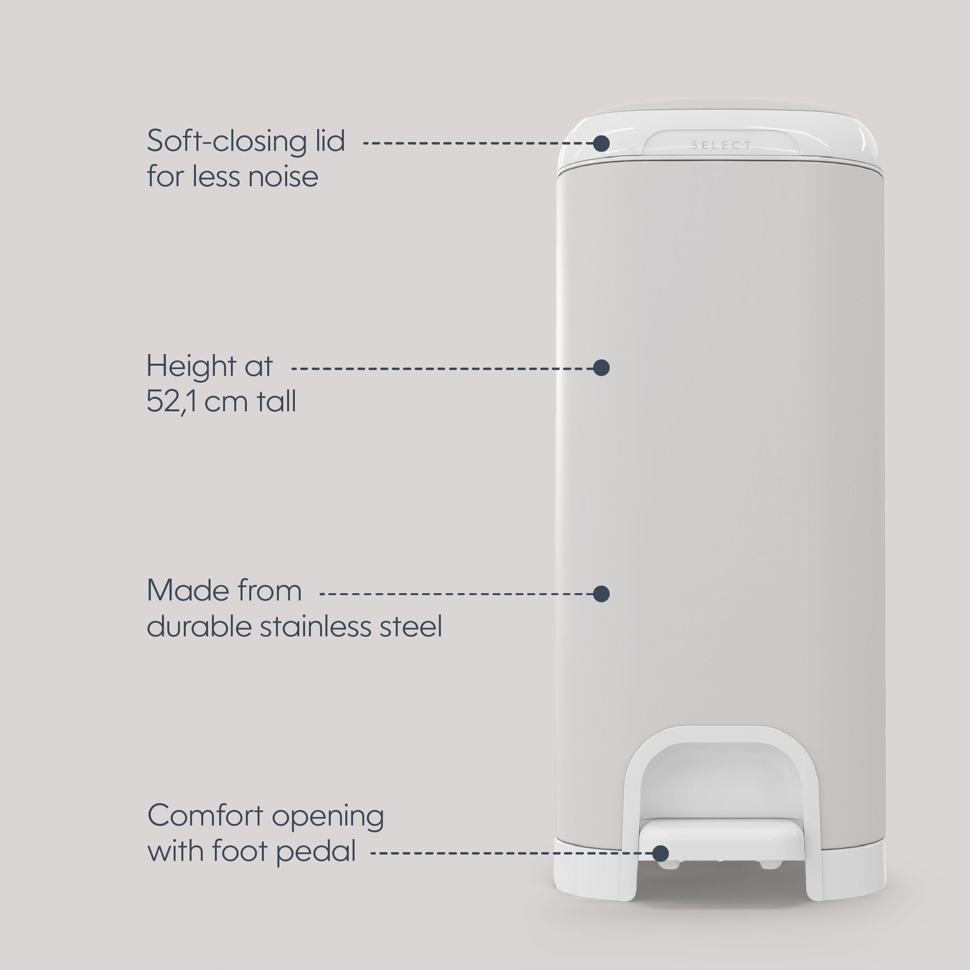 Introducing the new Diaper Genie Select Bin, a sleek addition to your nursery designed with both style and durability in mind. Crafted from durable stainless steel, the new Diaper Genie Select bin features a Push N Lock odour locking clamp that effectively helps to contain odours of messy nappies. For added convenience, the Select nappy disposal system features a 52.1 cm height and a wide opening, along with a foot pedal for easy, one-handed operation Our new metal nappy bin can hold up to 40 newborn diapers and comes with a multi-layer octagonal refill film, featuring our advanced Max Odour Lock technology. The XL octagonol refill can securely hold up to 810 newborn diapers, offering extended usability. The Diaper Genie Select is available in 3 colours : Lily White, Stone Grey and Sage Green.