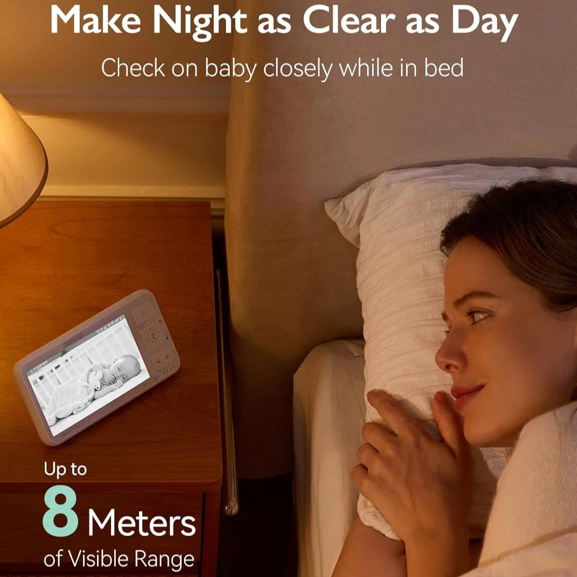 1080P 5.5-inch HD Display. See every detail with stunning clarity on the Momcozy baby monitor’s 1080P Full HD resolution and spacious 5.5-inch screen. Whether you’re working, exercising, or relaxing, this monitor brings you closer to your baby, offering reassurance with a quick glance.Strong, Secure Connection Without WiFi :Enjoy a reliable connection up to 1640 feet (500 meters) through walls and obstacles with this non-WiFi baby monitor. Utilizing FHSS closed-circuit technology, your feed is private and secure, accessible only to you. No WiFi required, ensuring your connection remains safe.All-Weather Protection, Day or Night :With up to 120 hours of use in ECO mode, the Momcozy baby monitor provides continuous protection for your little one. Its 5800 mAh battery and SmartSync technology ensure the BM03 model stays in standby for up to 5 days, so you never miss a moment of your baby’s activities.Enhanced Night Vision for Peaceful Nights:Enjoy worry-free nights with the 1080p baby monitor's infrared night vision, offering clear visuals up to 8 meters in total darkness. VOX alerts let you hear your baby immediately, with the screen automatically lighting up when sound is detected, keeping you connected through the night.