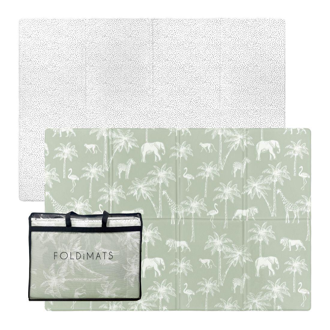 Safari and Dotty playmat features beautiful animals amongst swaying palm trees on a soft sage background and a classic polka dot on the reverse, adding charm to any room.